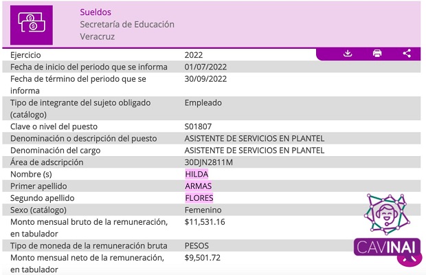 Y en el mismo periodo, Armas Flores ejerció el cargo de Asistente de Servicios en Plantel del preescolar Fernando Montes de Oca de Cosautlán de Carvajal, turno matutino y con clave 30DJN2811M, con un sueldo mensual de 9 mil 501 pesos.