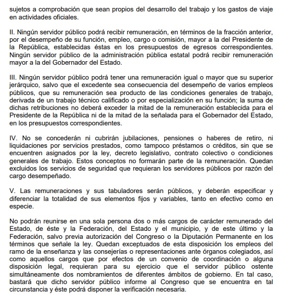 Cabe referir que la propia Constitución Política local, en su Artículo 82, limita a los servidores públicos del Estado y de los Municipios el desempeñar dos cargos remunerados, salvo la dispensa de Ley que pueda dar el Poder Legislativo.