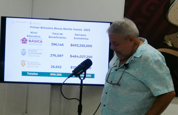 En el primer bimestre de este año de las becas Benito Juárez, el total de beneficiarios de Educación Básica es de 396,146, con una derrama económica de 693,255,500 pesos.