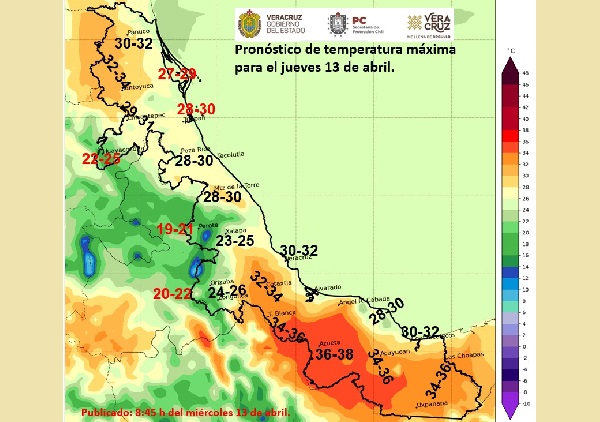 *Costa y llanura del centro*: medio nublado, probabilidad baja de lluvias. Posibles nieblas nocturnas a matutinas. Viento débil y variable por la mañana; fijándose al Este y Sureste después del mediodía con velocidades de 20 a 35 km/h. Ambiente relativamente caluroso al mediodía, templado a fresco por la noche a madrugada. Tmáx. 31-33°C en llanura y de 29 a 31°C en costa. Tmín. 18-21°C.