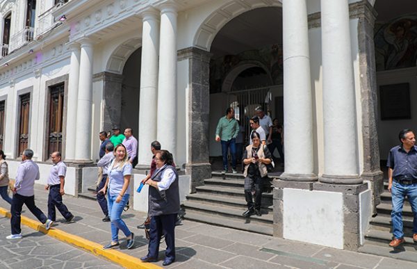Coatepec, Ver. (SANDY BARRADAS).- En punto de las 11:00 horas funcionarios del Palacio Municipal de Coatepec detuvieron labores y desalojaron el inmueble, esto como parte del Primer Simulacro Nacional de Sismo.