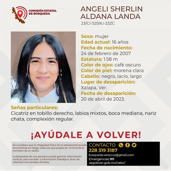 Según reportes la joven de 16 años responde al nombre de Angeli Sherlin Aldana Landa, familiares y amigos mediante las redes sociales han compartido la información con la esperanza de que esta misma llegue a mas gente y pueda ser encontrada con vida.