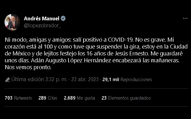 Ni modo, amigas y amigos: salí positivo a COVID-19. No es grave. Mi corazón está al 100 y como tuve que suspender la gira, estoy en la Ciudad de México y de lejitos festejo los 16 años de Jesús Ernesto. Me guardaré unos días. Adán Augusto López Hernández encabezará las mañaneras.…