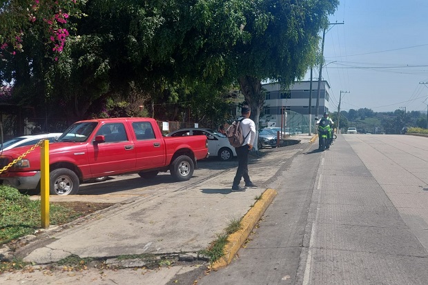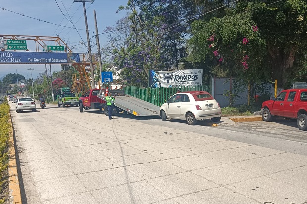Coatepec, Ver.- Luego de la denuncia ciudadana de autos estacionados sobre la banqueta y arroyo vehicular frente a la unidad deportiva Roberto Amorós, personal de la Delegación de Tránsito del Estado acudió a hacer un llamado a los propietarios, terminando por hacer el retiro de una unidad que se encontraba invadiendo parte del Bulevar Xalapa-Coatepec.
