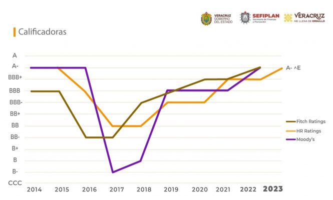 Xalapa, Ver.- La agencia HR Ratings modificó la estimación BBB+ por A- al Gobierno de Veracruz, pasando de positiva a estable la perspectiva sobre las finanzas estatales, como resultado de un incremento en los ingresos de libre disposición y mayor liquidez, además de un menor financiamiento de corto plazo en 2022.