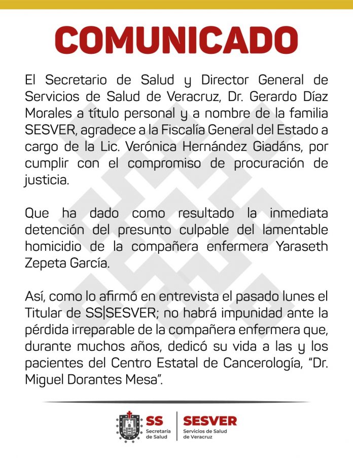 El secretario de Salud de Veracruz, Gerardo Díaz Morales, agradeció a la Fiscalía General del Estado (FGE), a cargo de Verónica Hernández Giadáns por la detención inmediata del presunto culpable del asesinato de la enfermera Yarazeth Zepeta García.