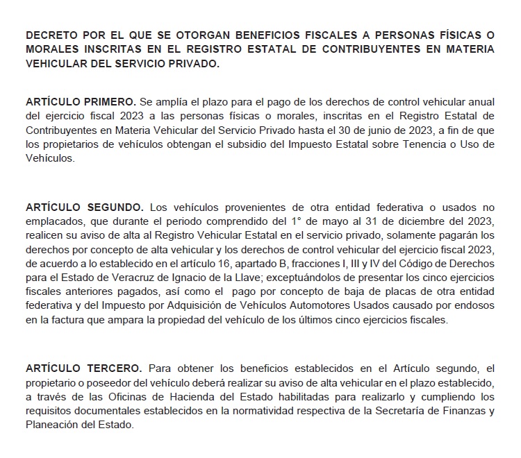 Adicionalmente, y mediante el artículo segundo: para los propietarios de vehículos provenientes de otra entidad federativa o usados no emplacados, que durante el periodo comprendido del 1° de mayo al 31 de diciembre del 2023, realicen su aviso de alta al Registro Vehicular Estatal en el servicio privado, solamente pagarán los derechos por concepto de alta vehicular y los derechos de control vehicular del ejercicio fiscal 2023