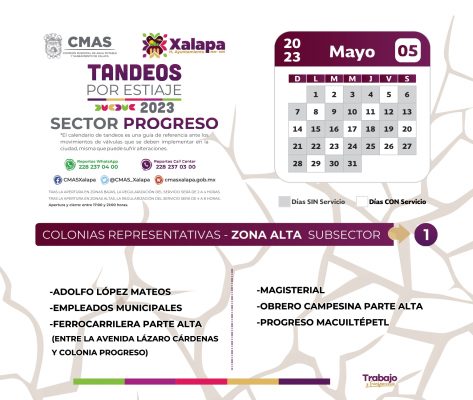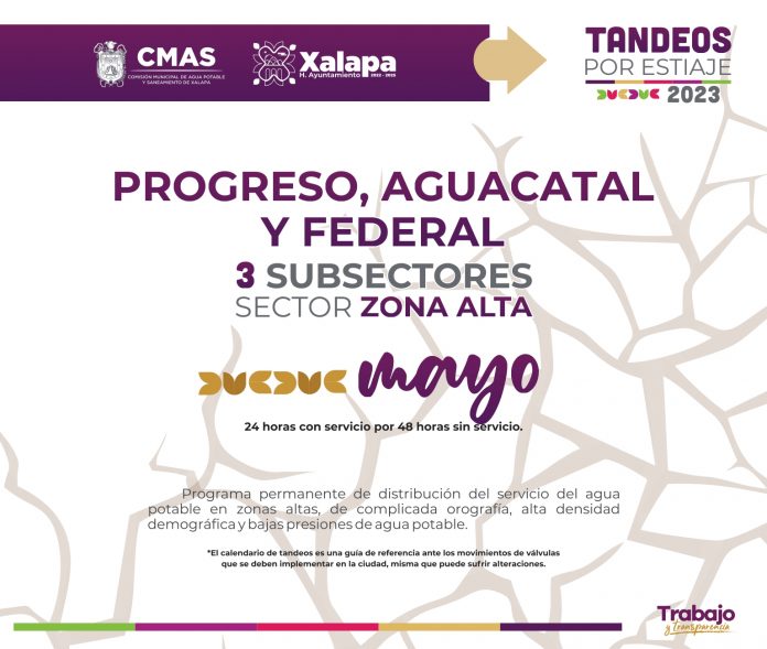Xalapa, Ver.- Ante la temporada de estiaje cuyos efectos se intensifican de abril a junio, la Comisión Municipal de Agua Potable y Saneamiento (CMAS) dio a conocer el programa de tandeo para mayo.