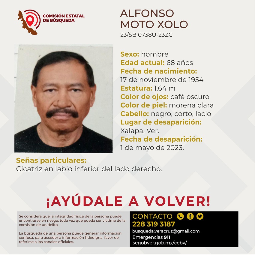 Un adulto mayor también reportado como desaparecido, responde al de nombre Alfonso Moto Xolo, de 68 años de edad; fue visto por última ocasión el pasado 1 de mayo en la ciudad de Xalapa.
