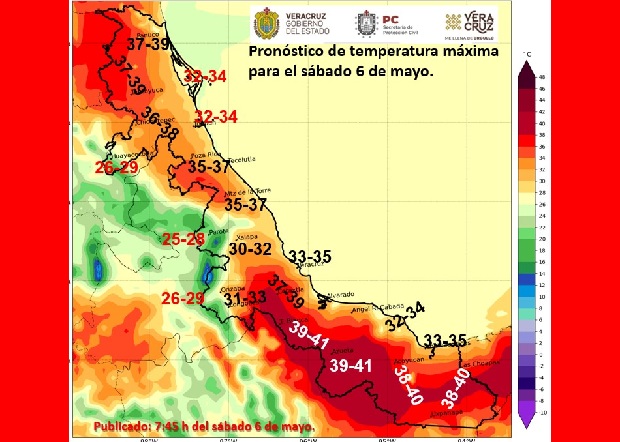 *Resumen*: En las próximas 24 horas se prevén pocos cambios en las condiciones meteorológicas, persistiendo ambiente caluroso y probabilidad baja de lluvias, excepto en partes altas de las zonas montañosas donde pueden registrarse eventos dispersos con algunas tormentas (actividad eléctrica, ráfagas de viento y posible caída de granizo) por la tarde a primeras horas de la noche. El viento dominante en la costa será del Norte, Noreste y Este de 20 a 35 km/h. Se recomienda: *no realizar acciones que puedan favorecer incendios forestales, de pastizales y de basureros*, no exponerse a periodos prolongados al sol, mantenerse hidratado y atender las indicaciones de las autoridades municipales de protección civil.