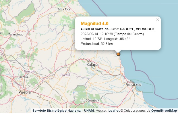 De acuerdo a lo reportado por el Servicio Sismológico Nacional, el sismo de magnitud 4.0 ocurrió a las 19:18 horas de este domingo y tuvo su epicentro 40 kilómetros al Norte de la localidad José Cardel, cabecera del municipio La Antigua.
