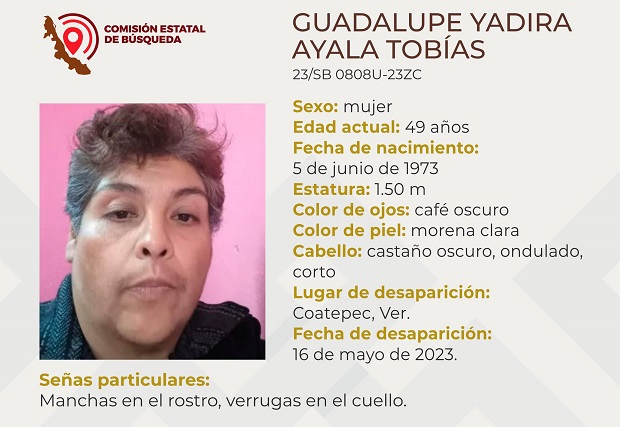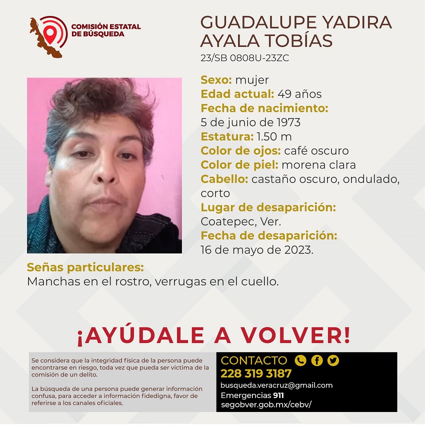 Coatepec, Ver.- Una mujer de 49 años de edad fue reportada como desaparecida en este municipio y la Comisión Estatal de Búsqueda ha emitido una ficha; piden ayuda para lograr su pronta localización.