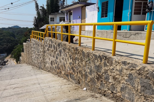 En sitios donde la banqueta quedó a un nivel más alto, fueron instalados barandales para dar más seguridad a los peatones que a diario caminan por esta calle.