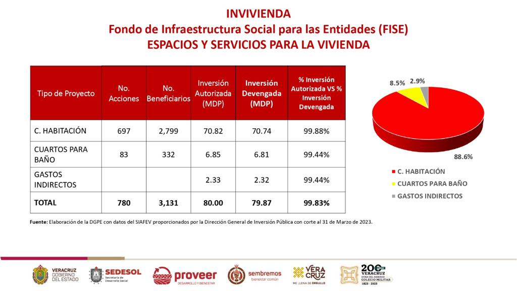 Por otra parte, la CAEV ejecutó 283.68 mdp del FISE y 837.37 de otros fondos hacia proyectos de agua potable, plantas de tratamiento, drenaje, alcantarillado, captación de agua de lluvia y pozos profundos. En tanto que, el Instituto Veracruzano de la Vivienda usó 79.87 del FISE y 70.7 de otros fondos en 211 acciones de viviendas completas, cuartos habitación y para baño, muros de contención, y la entrega de hogares a deudos de instituciones de Seguridad Pública.
