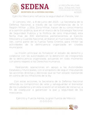 “Más de 300 elementos pertenecientes al Ejercito Mexicano y Guardia Nacional arribaron al municipio de Perote, como parte de la Fuerza Tarea Oriente, para inhibir las actividades de la delincuencia organizada”.