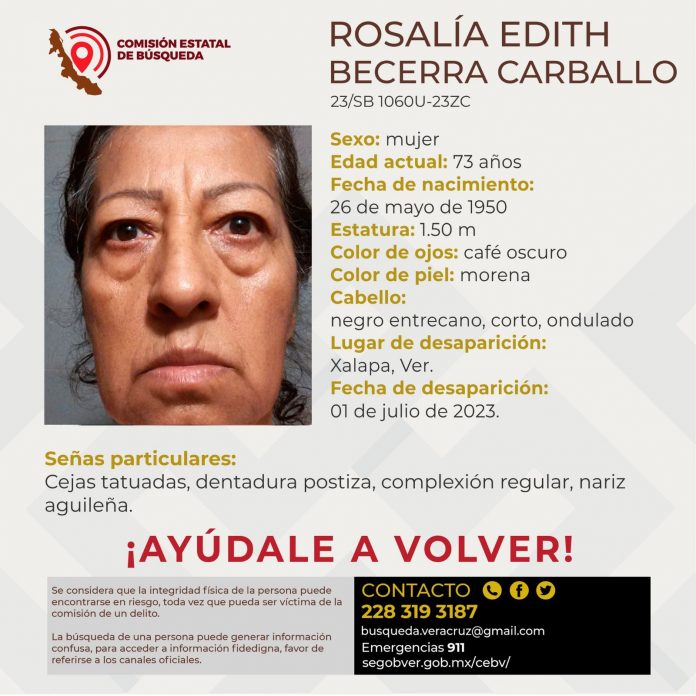 Se trata de Rosalía Edith Becerra Carballo, de 73 años de edad quien mide 1.50 metros de estatura, tiene piel color morena, cabello negro entrecano, corto y ondulado, así como ojos color café. Desapareció el primero de julio.