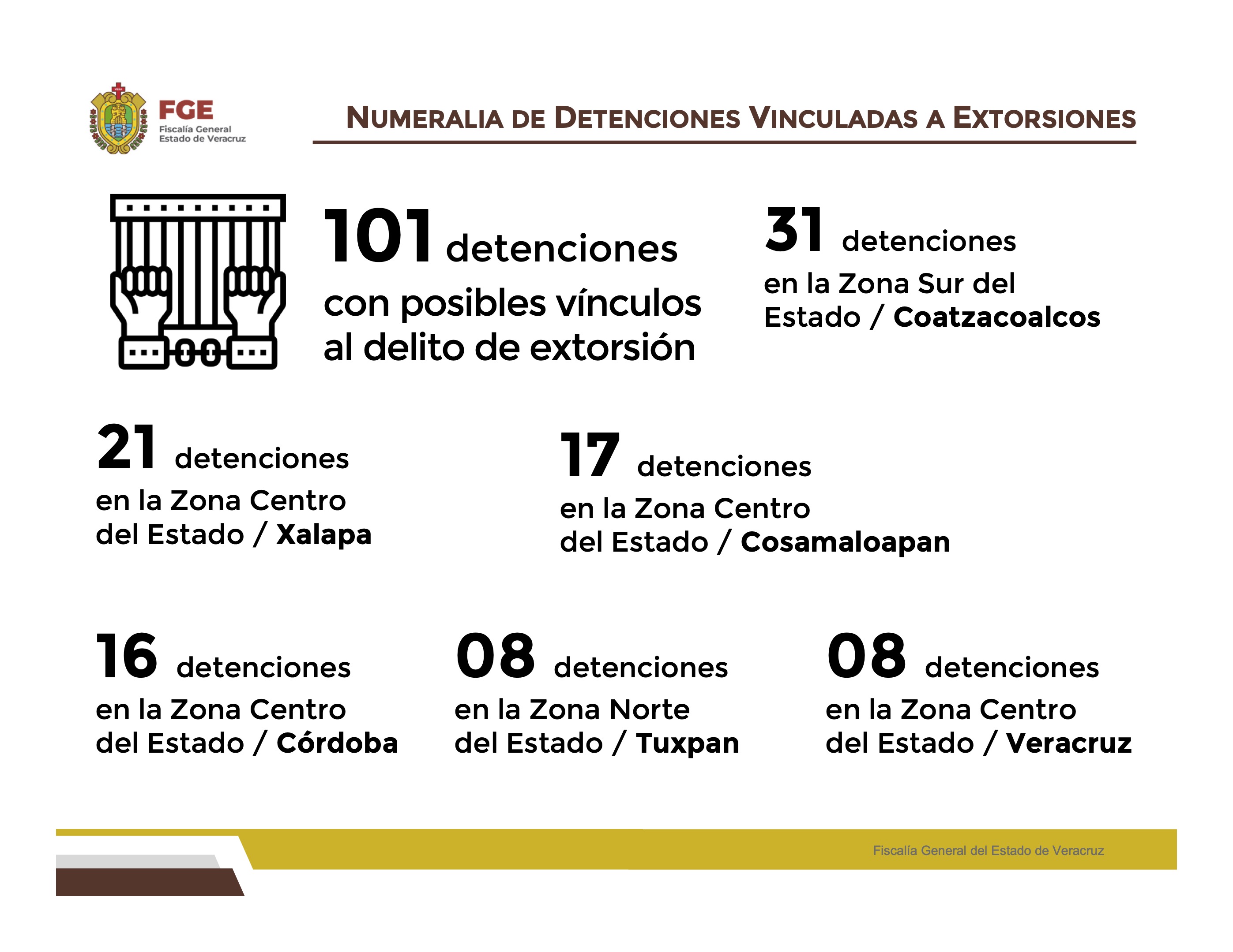 Xalapa, Ver.- De enero a junio, a través del seguimiento que da la Coordinación Estatal para la Construcción de la Paz y la Fiscalía General del Estado (FGE) se han detenido y vinculado a proceso judicial 101 personas por posibles vínculos al delito de extorsión.