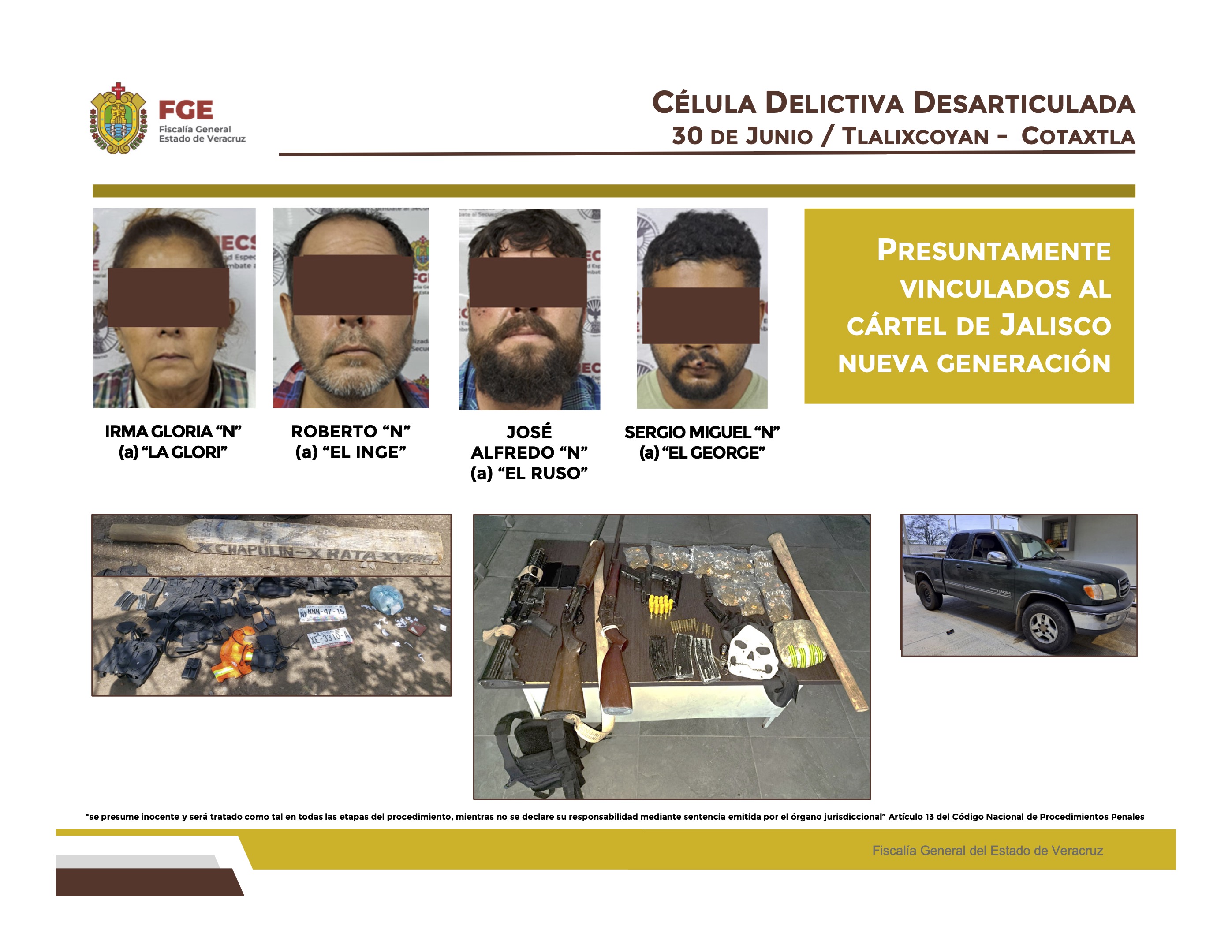 Respecto al operativo realizado el 30 de junio en Tlalixcoyan y Cotaxtla, se explicó que derivó de la desarticulación de una célula del Cártel Jalisco Nueva Generación, aprehendiendo a Sergio Miguel “N”, Irma Gloria “N”, Roberto “N” y José Alfredo “N”, quienes están siendo investigados por homicidios, privaciones y secuestros.