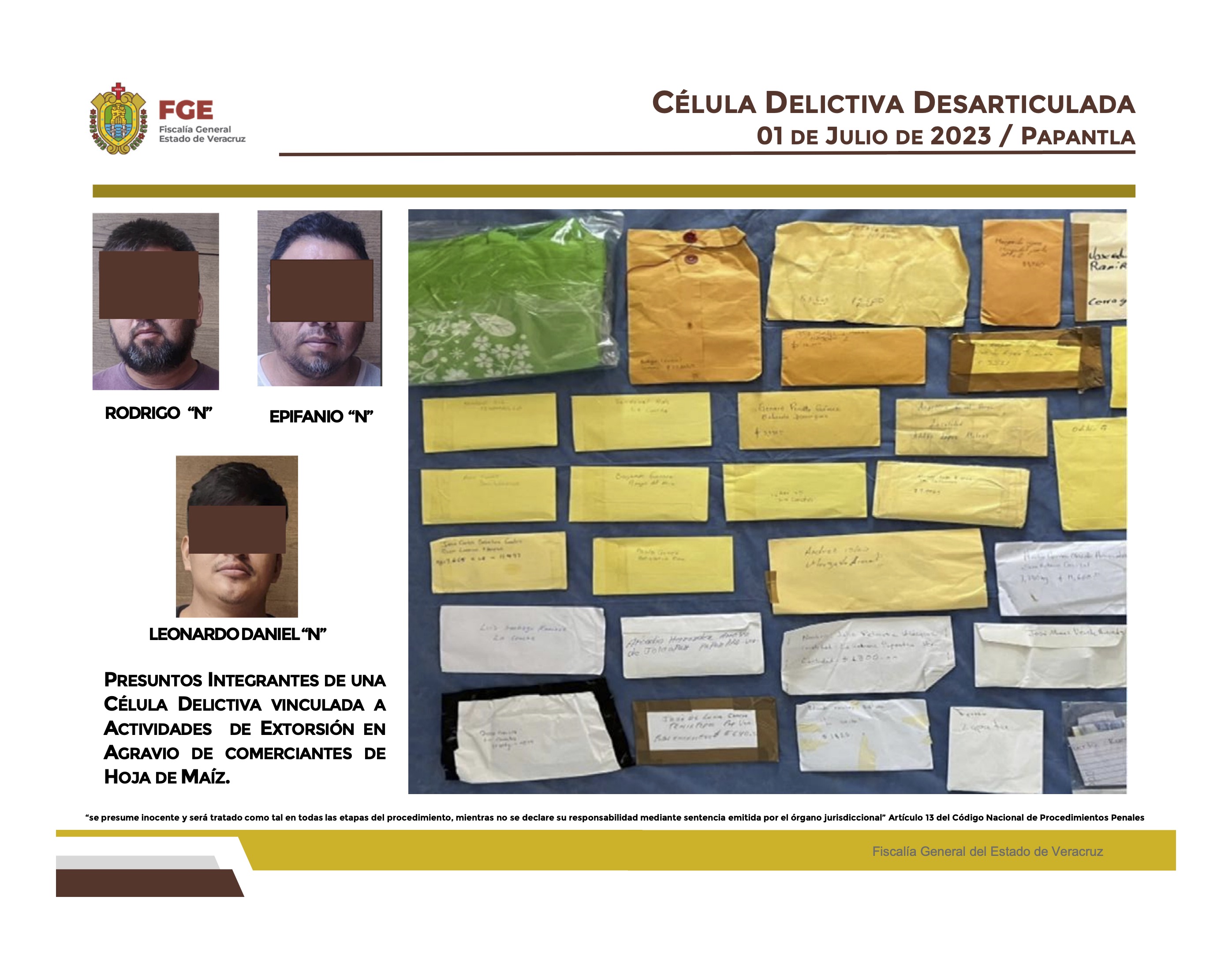 Con ello el Ejecutivo dio un avance respecto a la extorsión a comerciantes de hoja de maíz en la región de Totonacapan; ahí la FGE vinculó a Rodrigo “N”, Epifanio “N” y Leonardo Daniel “N”, detenidos por elementos de la Secretaría de Seguridad Pública que les aseguraron 29 sobres que tenían escrito la cantidad y las personas a quienes causaban perjuicio.
