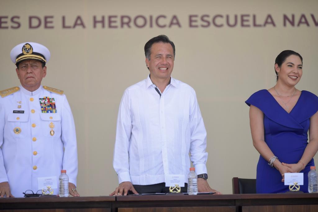 Junto al secretario de Marina, Almirante José Rafael Ojeda Durán, el gobernador Cuitláhuac García Jiménez reconoció a los 75 nuevos marinos de Cuerpo General, 35 de Infantería, 10 de Aeronáutica Naval, 6 de Ingeniería en Electrónica y Comunicaciones, 12 de Ingeniería Mecánica Naval y 24 de Ingeniería en Logística Naval.