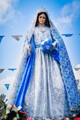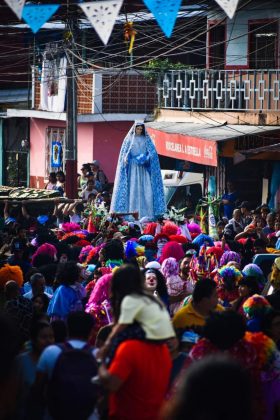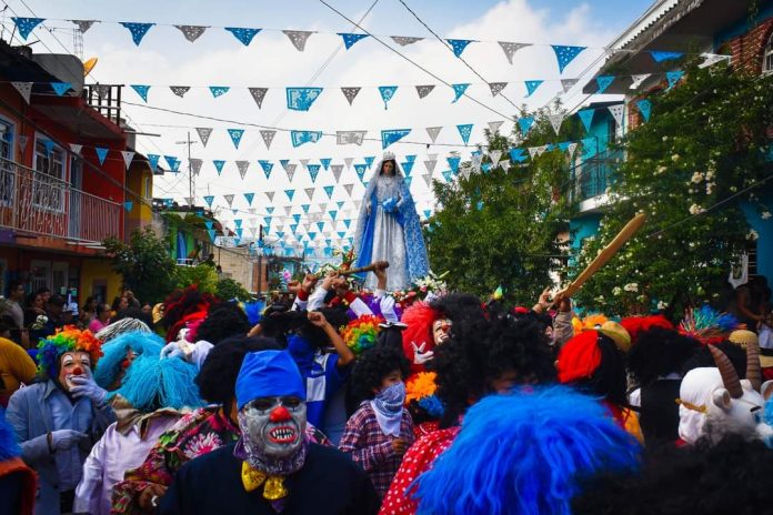 Entre danzas y coloridos disfraces, la imagen de la Virgen de la Asunción encabezó el recorrido del arco, el cual representa un símbolo de la identidad y unión como comunidad.