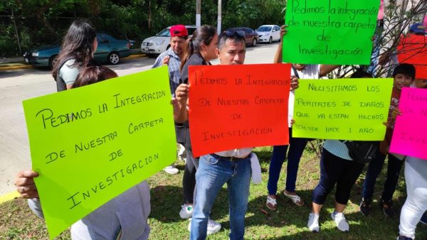 Con pancartas exigieron que se integre la carpeta de investigación pues son más de 500 las viviendas afectadas y de las que solo en 98 han sido reparados los daños.