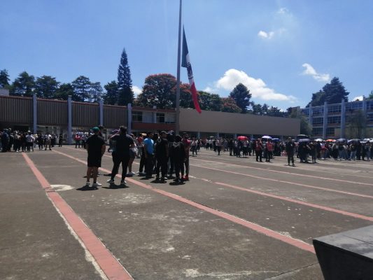 A las 11:00 horas la alarma sísmica sonó y los estudiantes, docentes, así como personal administrativo se congregaron en la explanada de la escuela; mientras los pequeños del jardín de niños también se colocaron en una zona de resguardo y protección, en tanto los alumnos de la primaria se reunieron en la explanada de su plantel.