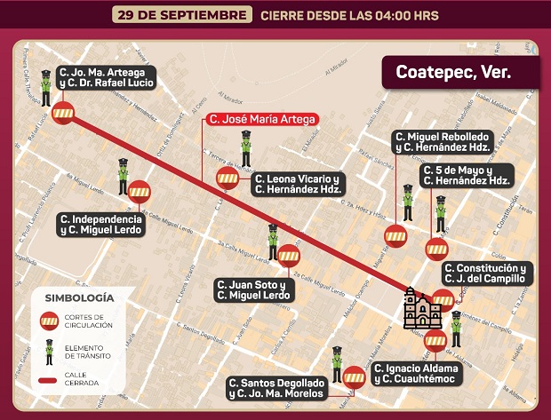 Coatepec, Ver.- La Secretaría de Seguridad Pública a través de la Dirección General de Tránsito y Seguridad Vial, en apoyo al ayuntamiento de este municipio, informa que con motivo de las festividades de San Jerónimo se desplegará un dispositivo de seguridad vial en las principales calles del centro, cerrando el acceso vehicular.