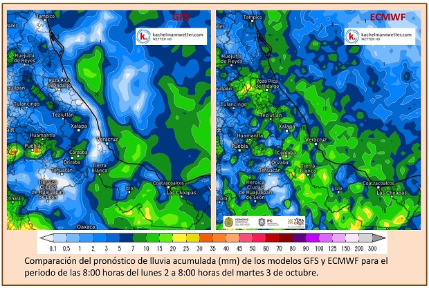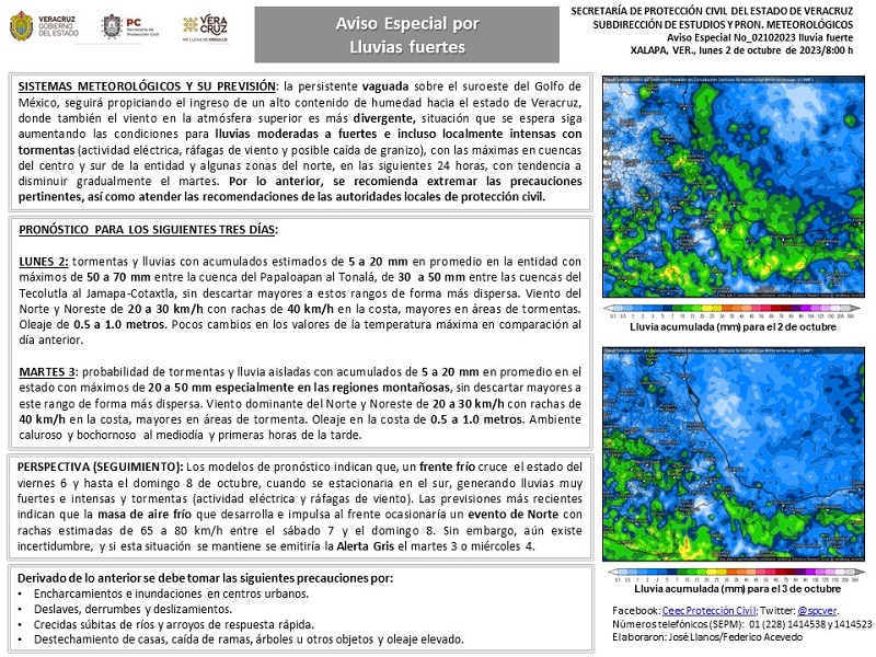 Xalapa, Ver.- El Centro de Estudios y Pronósticos Meteorológicos ha emitido esta mañana un «Aviso Especial por Lluvias Fuertes» que se resentirá en el Estado de Veracruz a partir de este lunes 2 de ocrubre.