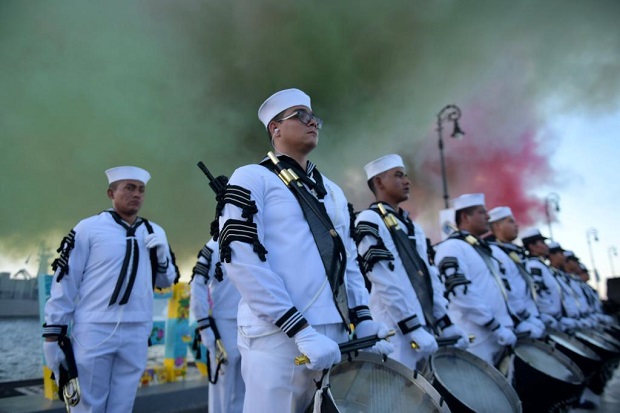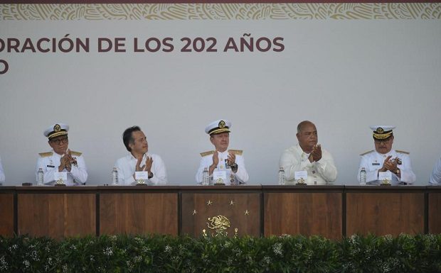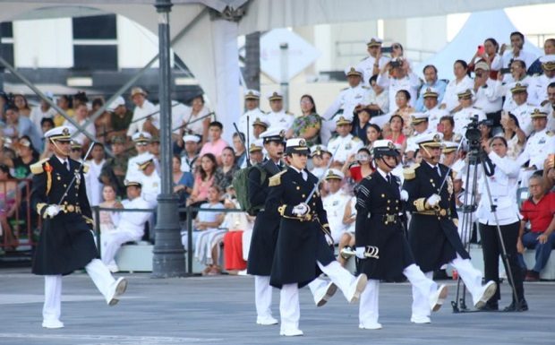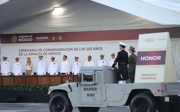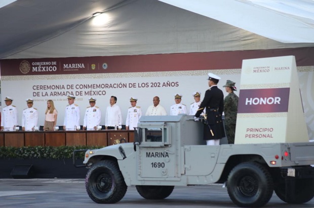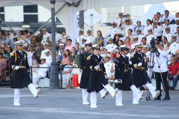 Desde el palco instalado en la Macroplaza del Malecón, la celebración inició con los respectivos honores plenos a la máxima autoridad naval y posteriormente se dio lectura a la reseña histórica del 4 de octubre de 1821, fecha en que se instauró la institución operativa de la dependencia federal.