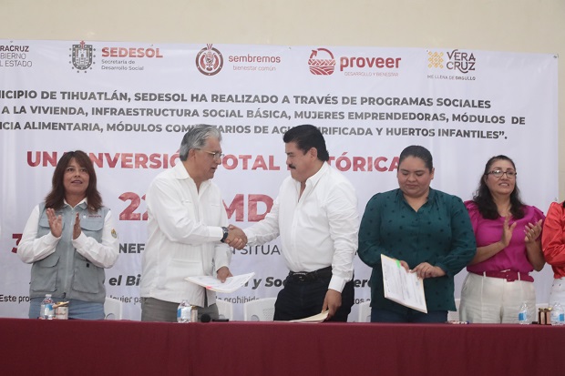 Tihuatlán, Ver.- La Secretaría de Desarrollo Social signó el convenio marco y específico de colaboración institucional con el Ayuntamiento de Tihuatlán para obras de mejoramiento de vivienda, con la ejecución de 50 pisos firmes, acción que se sumaría a la inversión ejecutada de 2019 a la fecha, dentro del municipio, por más de 22 millones de pesos.