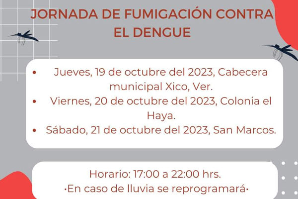 Xico, Ver. (SANDY BARRADAS).- El Ayuntamiento de Xico informó que en próximos días, personal de la Secretaría de Salud llevará a cabo una fumigación en la cabecera, así como las localidades de El Haya y San Marcos de León.De acuerdo a información, estas acciones se realizarán a partir del jueves 19 de octubre en la cabecera municipal, mientras que el viernes 20 de octubre será en la localidad de El Haya y el sábado 21 de octubre en San Marcos de León.