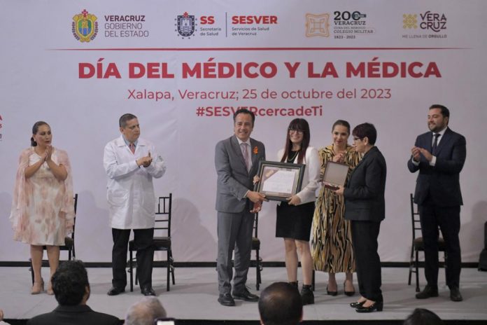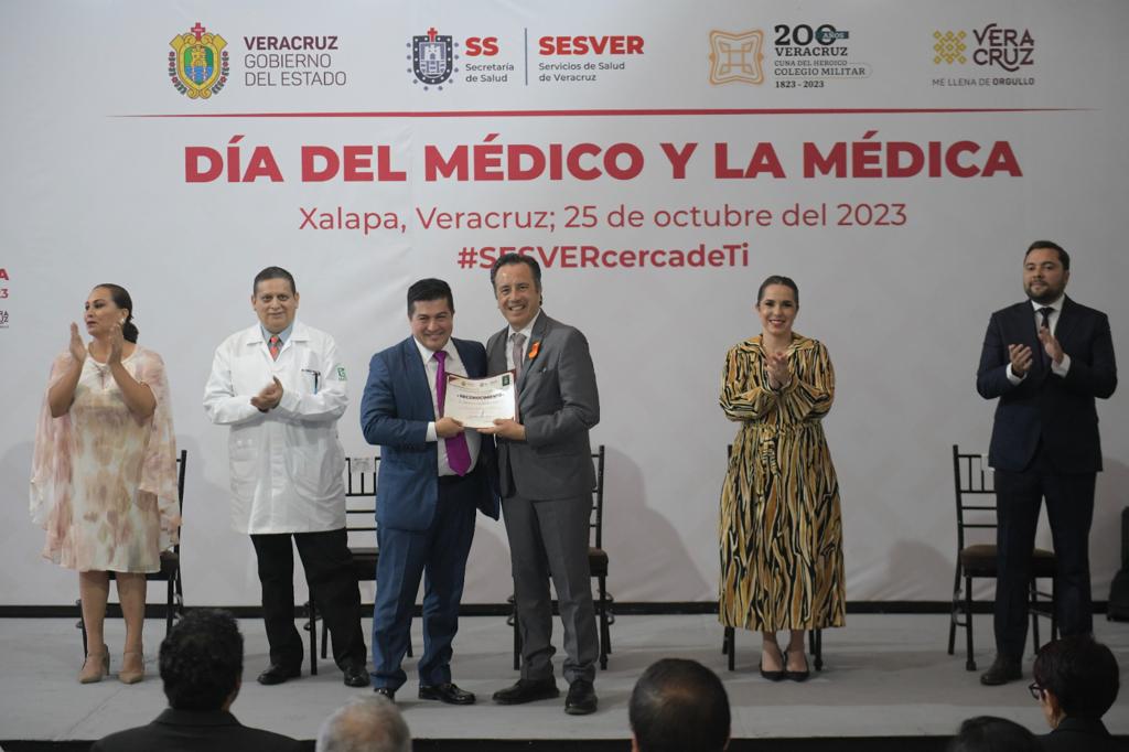Xalapa, Ver.- En el Día del Médico y la Médica, el gobernador Cuitláhuac García Jiménez entregó la condecoración al Mérito Profesional “Doctor Pedro Rendón Domínguez” a Roberto Peralta Juárez, médico internista y especialista en Infectología del Hospital General de Zona (HGZ) número 24 del Instituto Mexicano del Seguro Social.