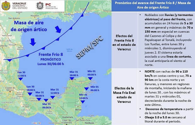 De acuerdo al reporte del organismo dependiente de la Secretaría de Protección Civil de Veracruz, se espera que el #FFrío8 y el evento de Norte, provoquen: