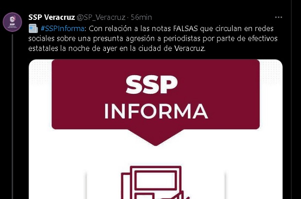 ???? #SSPInforma: Con relación a las notas FALSAS que circulan en redes sociales sobre una presunta agresión a periodistas por parte de efectivos estatales la noche de ayer en la ciudad de Veracruz. pic.twitter.com/bVigqjFDVJ