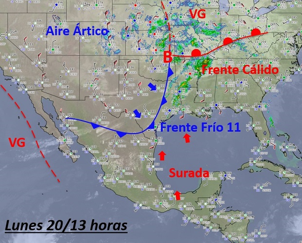 Xalapa, Ver.- Datos de superficie indican que el Frente Frío número 11 ha ingresado al Golfo de México y los pronóstico ahora señalan que cruzaría Tampico entre las 3 y 4 am y el puerto de Veracruz entre las 8 y 9 am del martes, informó el Centro de Estudios y Pronósticos Meteorológicos la noche de este lunes.