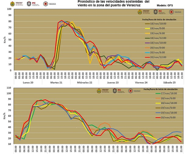 Atento Veracruz los resultados de los modelos GFS y ECMWF indican evento de Norte con rachas máximas de 90-105 km/h en la costa, mañana martes con tendencia a decrecer en el transcurso del miércoles.