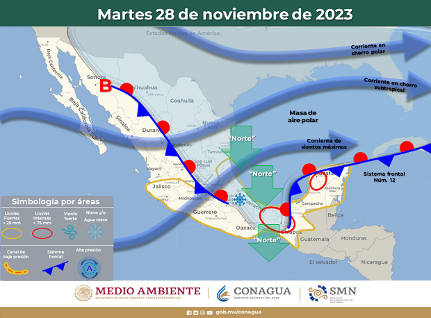 El frente frío Núm. 12 se extenderá sobre la Mesa del Norte, la Mesa Central y el sureste de la República Mexicana, mantendrá su interacción con el abundante ingreso de humedad generado por la corriente en chorro subtropical y una corriente de vientos máximos, condiciones que originarán lluvias aliadas en Baja California Sur, el noroeste y norte del país, chubascos y lluvias fuertes en el noreste, centro, oriente y sureste del territorio nacional, pronosticándose lluvias puntuales torrenciales en Veracruz, Chiapas y Tabasco; lluvias intensas en Puebla y Oaxaca; y muy fuertes en Tamaulipas, San Luis Potosí, Hidalgo y la Península de Yucatán. Las lluvias pronosticadas podrán estar acompañadas de descargas eléctricas.