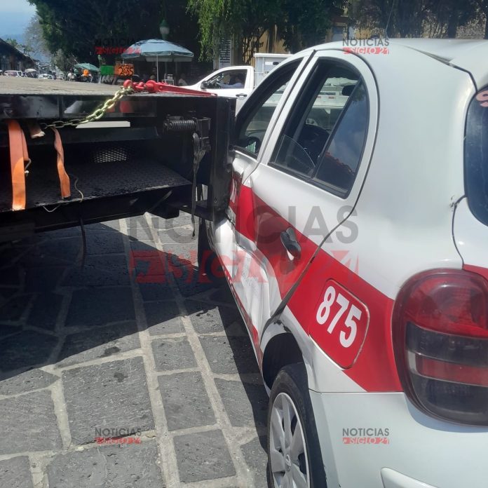 Coatepec, Ver; 15 de Abril, 2026.- Alrededor del mediodía este miércoles se presentó un percance entre un taxi Nissan March y una grúa.