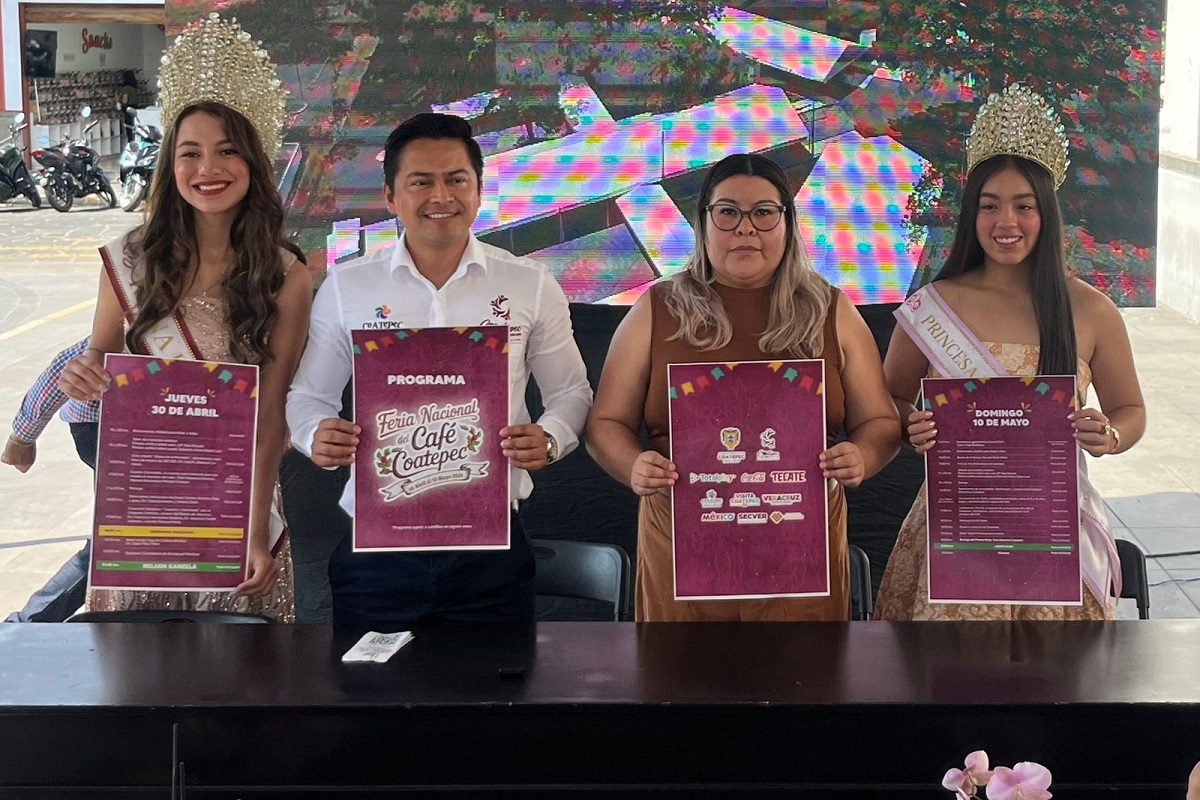 Coatepec, Ver; 22 de abril de 2026.- Esta mañana el primer edil de Coatepec, el alcalde Jorge Ignacio Luna junto a la síndica Stephanie Platas Osorio, la reina del café Constanza I y la princesa de la orquídea, Amaya García presentaron la Feria Nacional del Café en una rueda de prensa frente a medios de comunicación.