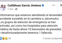 Xalapa, Ver.- El gobernador de Veracruz, Cuitláhuac García Jiménez, informó que en el accidente vehicular registrado en la carretera a Jalcomulco se reportaron 10...